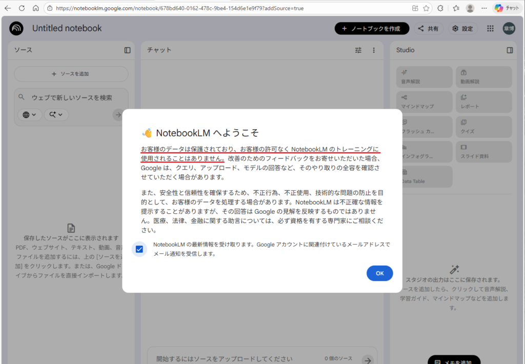 お客様のデータは保護されており、お客様の許可なくNotebookLMのトレーニングに使用されることはありません。