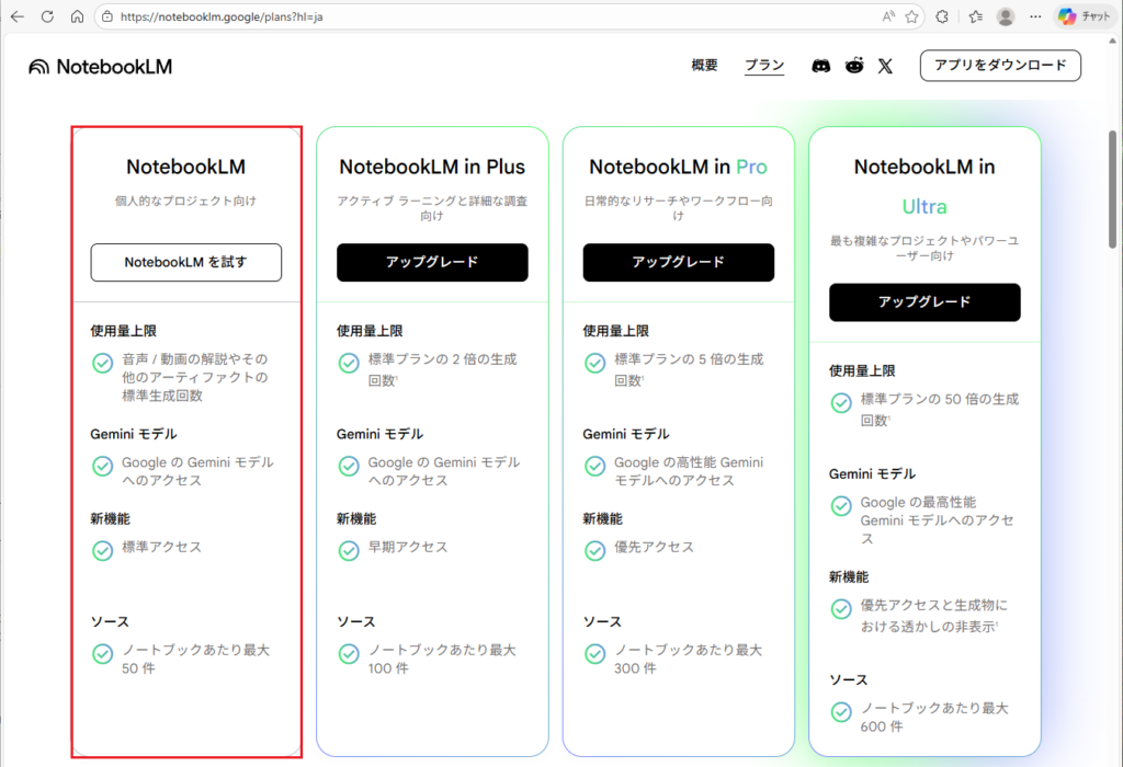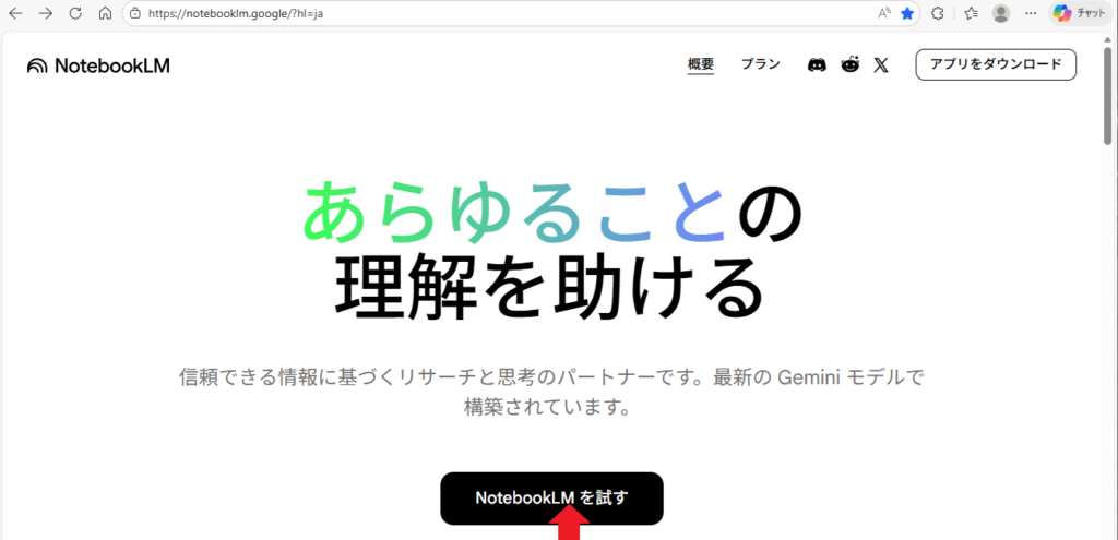 https://notebooklm.google/?hl=ja にアクセスして「NotebookLMを試す」とポチッとします。