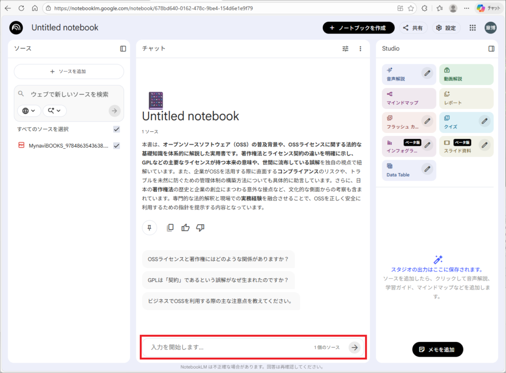 NotebookLMに拙著をソースとして読み込ませるだけですが、一つ一つ手順を紹介します。