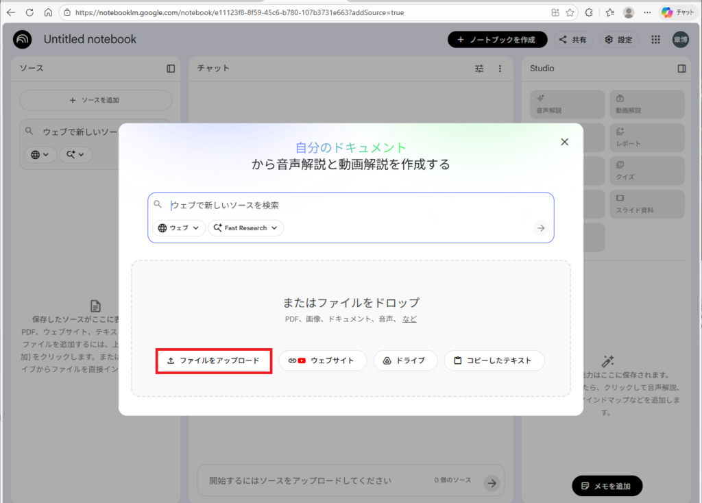 ダウンロードしたPDFをNotebookLMで読み込みます。