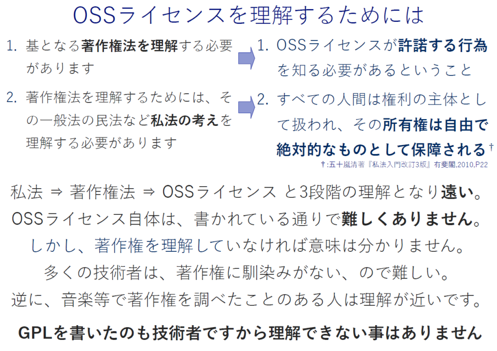 首記の拙著は、OSSライセンスを著作権法を軸に論理的に理解しようとする方には、好評を得ているかと自負しておりますが、ネット上の情報を鵜呑みをしている一部の方には不評のようです。論理的に理解いただこうとすると、多段階の理解をすることが必要で、それが少なくない方の理解の障壁になっているようです。